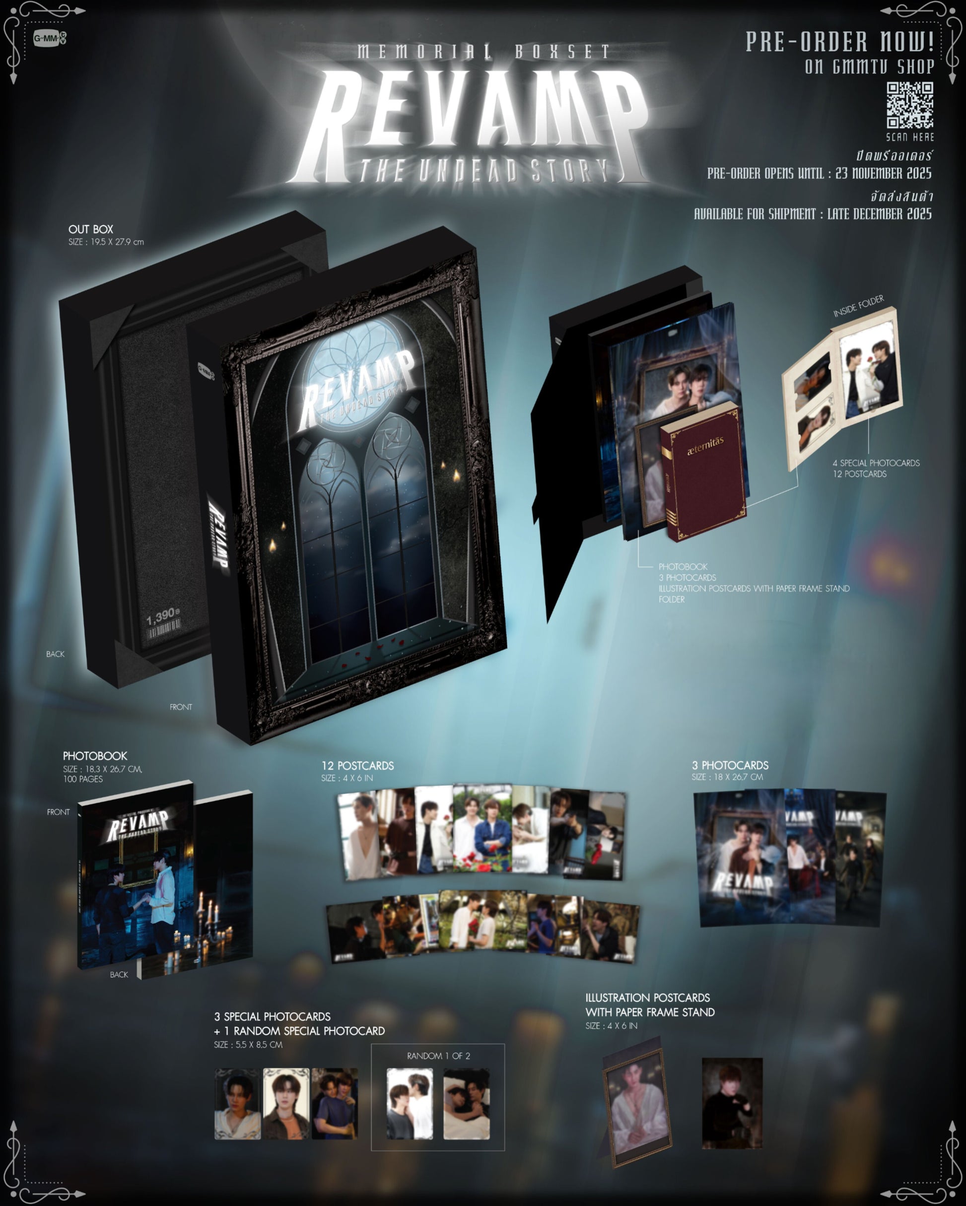 Boxset that captures the unforgettable moments from REVAMP THE UNDEAD STORY — The story follows Punn (Prem), an antique shop owner and restorer. One day, he is hired to repair a damaged portrait painting. While working on it, he accidentally cuts himself, and his blood awakens Ramil (Boun), a vampire who has been sealed within the painting. At first, Punn refuses to believe what he sees, but he eventually agrees to help Ramil regain his lost powers and find his followers, including Methus, the owner of Ramil’s bound painting. They must flee from the vampire hunters who are determined to destroy them. Relive all the iconic scenes and heartwarming moments from the series with this beautifully curated MEMORIAL BOXSET, complete with exclusive special gifts available only in this edition.