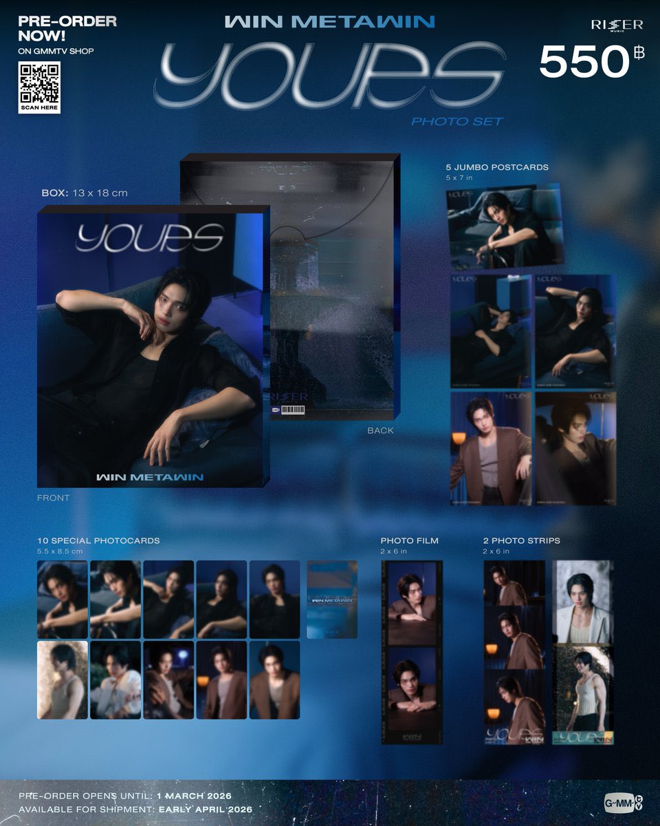Win Metawin’s latest photo set from his hot single "YOURS"! Includes jumbo postcards, special photcards, photo strips, and a photo film.