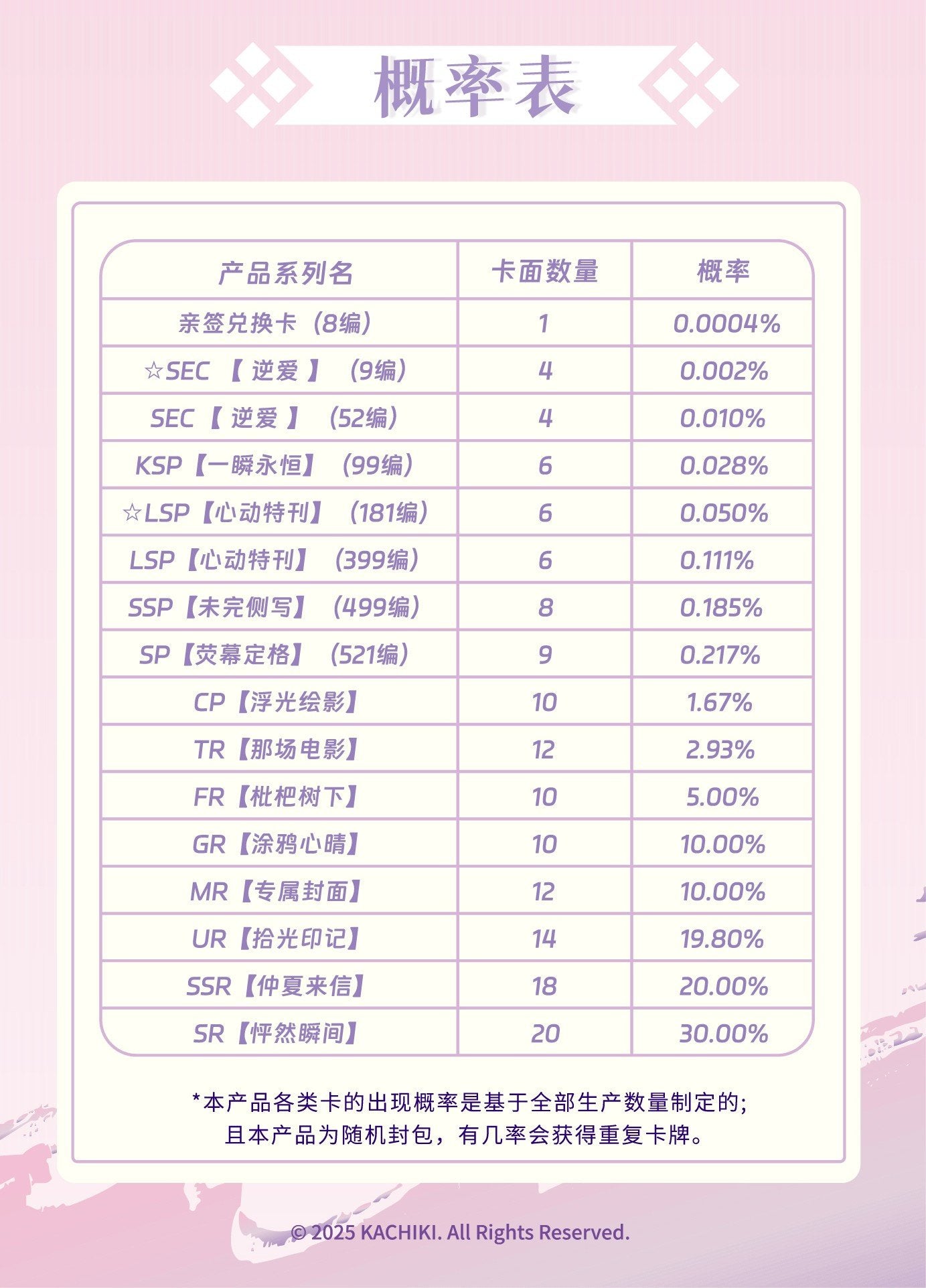 Most examples shown are rare cards, with a low chance of appearance as stated in the title and percentage.